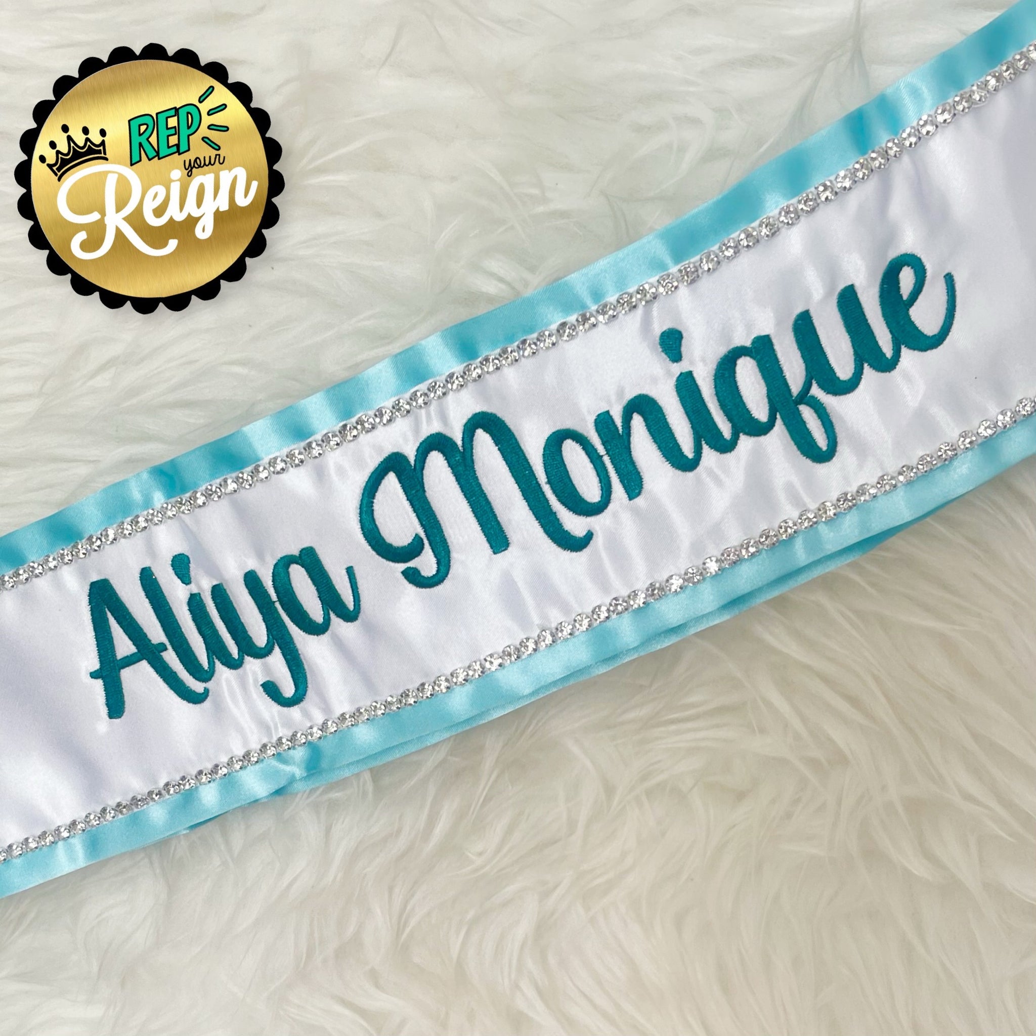 Let Rep Your Reign personalize the back of your sash with your name!
